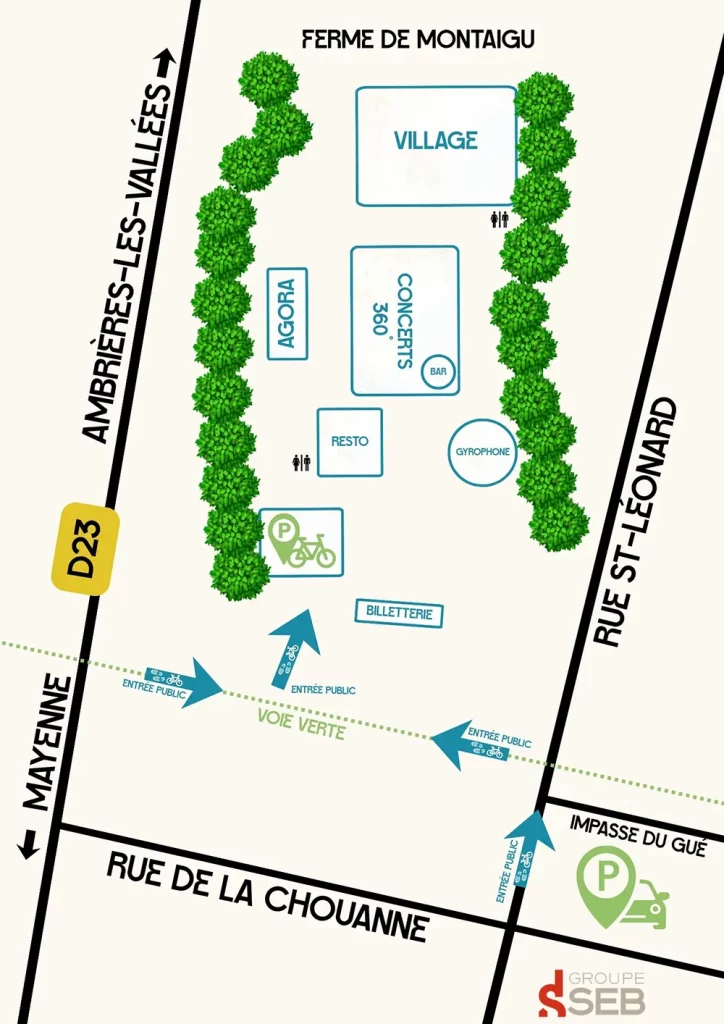 L’accès au site de la Ferme de Montaigu se fait uniquement à pieds ou à vélo, via la voie vert (chemin Chouanneteau). L’accès est interdit par Montaigu. Le parking vélos est situé sur le site de la Ferme de Montaigu. Le parking voitures est celui du groupe Seb Moulinex, situé rue de la Chouanne.
