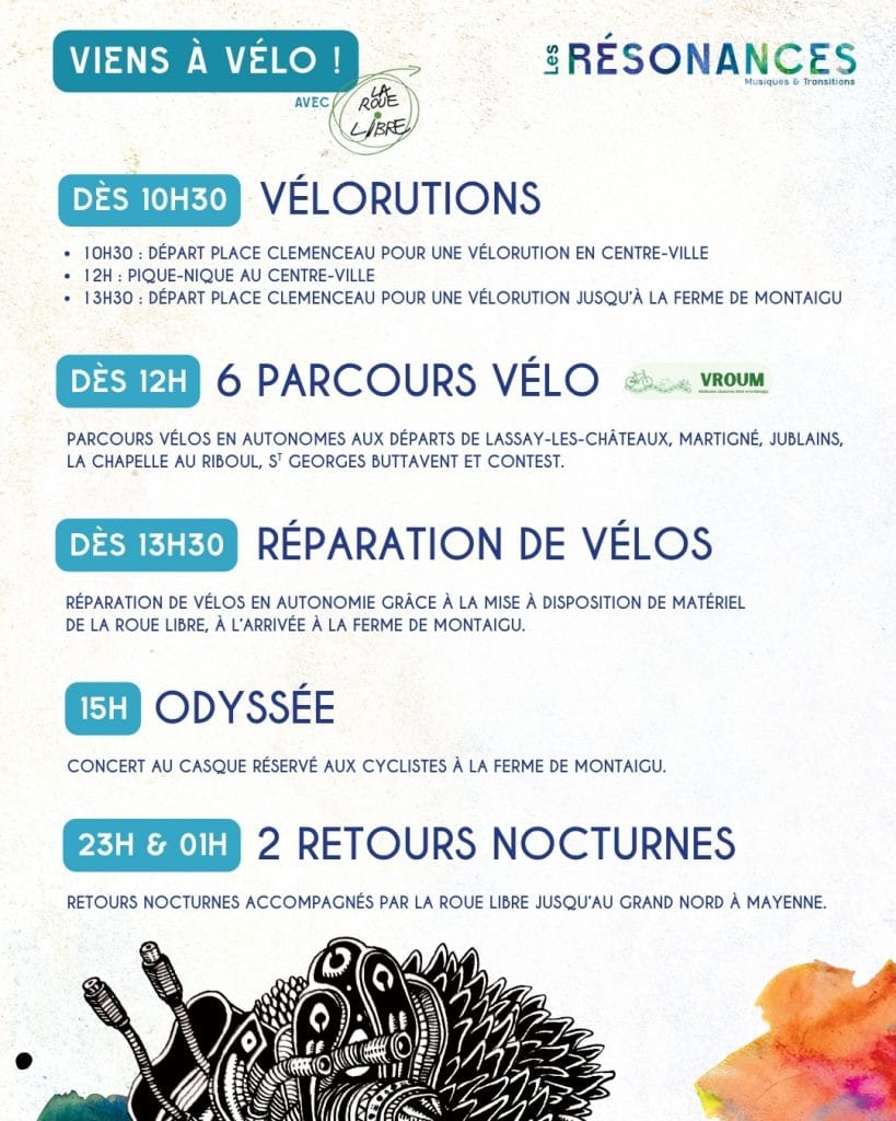 Aux Résonances, on explore la transition sous toutes ses formes — et la mobilité en fait pleinement partie. Alors, venez à vélo ou à pied : c’est plus simple, plus convivial, et totalement dans l’esprit de l’événement. Avec La Roue Libre, on vous propose de venir à la Ferme de Montaigu en vélo le 25 avril !
